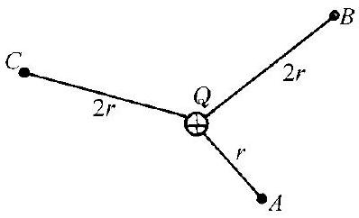 在电荷量为 $Q$ 的点电荷所产生的电场中有 $A 、 B 、 C$ 三点,$A$ 点离 $Q$ 为 $r, B 、 C$ 两点离 $Q$ 均为 $2 r$ ,如图1.4.22所示。现将电荷量为 $q$ 的点电荷从 $A$ 移到 $B$ ,试求电场力做的功 $W_{A B}$ ;将 $q$ 从 $A$ 移到 $C$ ,试求电场力做的功 $W_{A C}$ 。若将 $q$ 从 $B$ 移到 $C$ ,电场力做的功是多少?