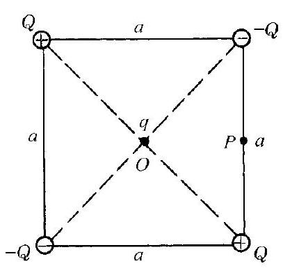 在边长为 $a$ 的正方形顶点,各有一个固定的点电荷,它们的电荷量分别为 $Q 、-Q 、 Q$ 和 $-Q$ ,如图1.4.24所示.现将电荷量为 $q$ 的点电荷从中心 $O$移到右边的中点 $P$ ,试求电场力对它做的功.如果四个点电荷的电荷量都是 $Q$ ,则 $q$ 从 $O$ 移到 $P$ ,电场力对它做的功又是多少? | 【解】 $q$ 从 $O$ 移到 $P$ ,电场力对它做的功为
