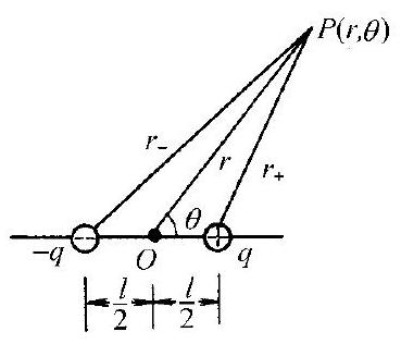 U=\frac{q}{4 \pi \varepsilon_{0}}\left[\frac{1}{\sqrt{r^{2}-r l \cos \theta+l^{2} / 4}}-\frac{1}{\sqrt{r^{2}+r l \cos \theta+l^{2} / 4}}\right]