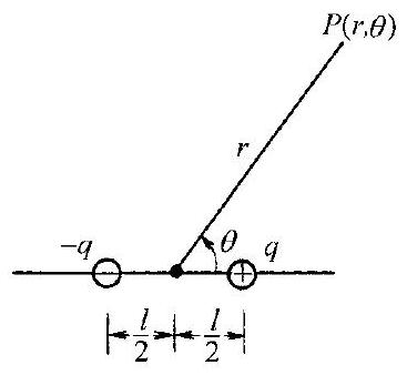 电荷量分别为 $q$ 和 $-q$ 的两个点电荷,相距为 $l$ ,以它们连线的中点 $O$ 为原点,连线为极轴,取极坐标系,如图1.4.25(1)所示,试求 $q$ 和 $-q$ 在 $P(r, \theta)$点产生的电势。当 $r \gg l$ 时,结果如何?
