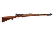 A wooden rifle with a black barrel and a scope on top is displayed against a white background.