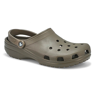 A pair of brown crocs with a silver buckle on the left shoe.