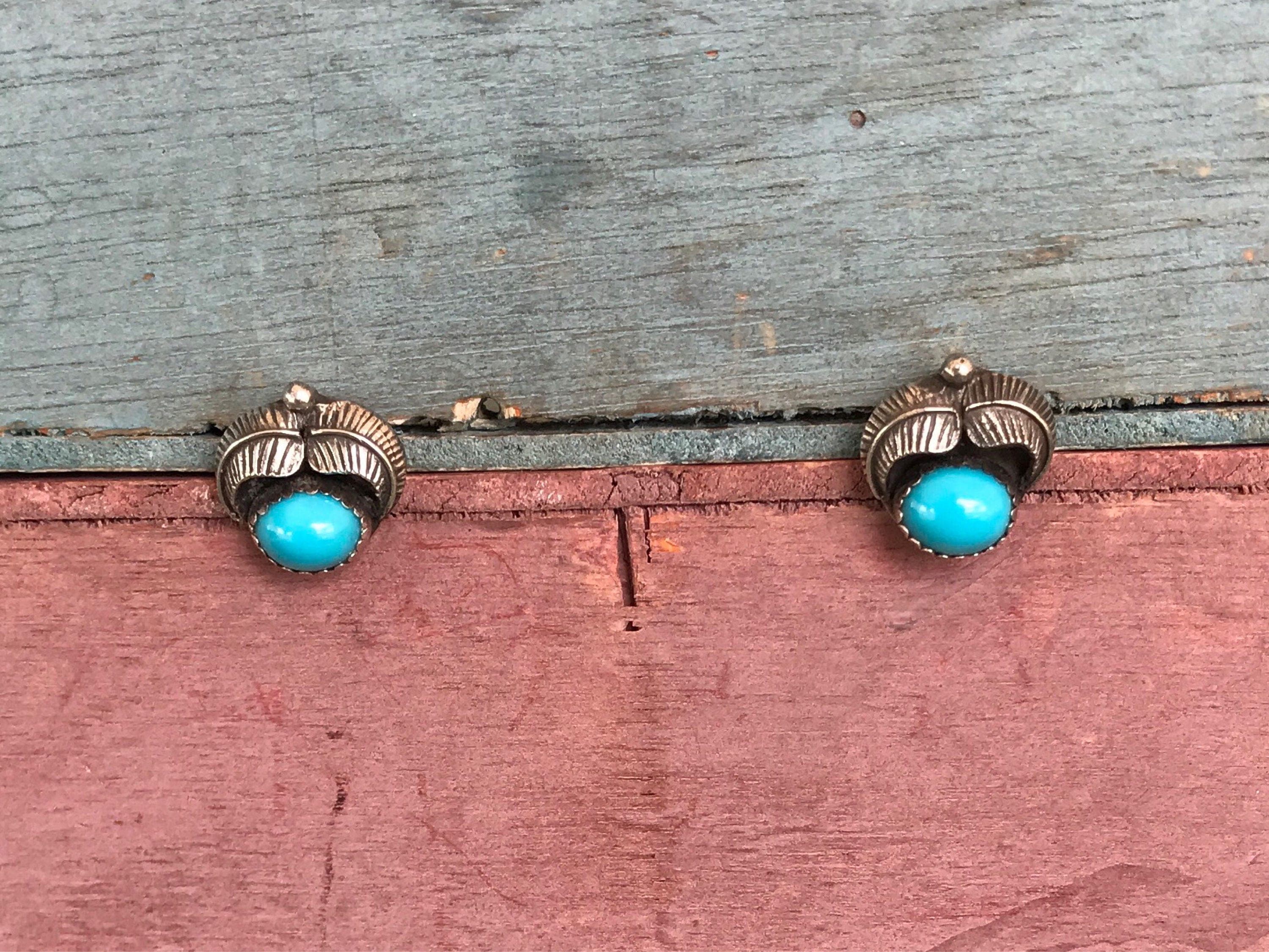 A pair of silver earrings with turquoise stones are displayed on a wooden surface with a blue and red gradient background.