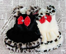 Két fekete-fehér foltos kutyapulóver piros masnival fehér alapon újságmintázatú.