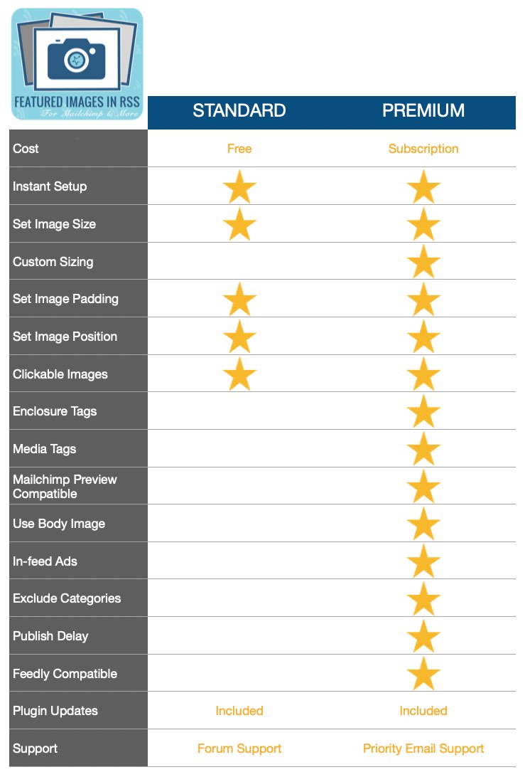A table with a header row labeled 'Featured Images' and a row labeled 'Standard Premium'. Below these headers, there are multiple rows with various features and their corresponding number of stars.