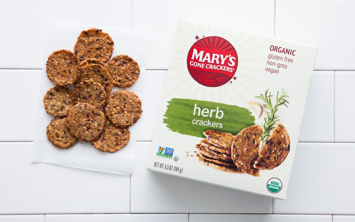 Egy doboz Mary's Organic Herb Crackers egy fehér csempézett felületre kerül. A doboz nyitva van, és néhány keksz van szétszórva körülötte. A kekszeket körkörösen helyezték el, némelyik laposan fekszik, mások pedig egyenesen állnak. A doboz piros-fehér dizájnnal rendelkezik, amelyen jól láthatóan a „Mary's Organic” és a „Herb Crackers” felirat látható. A csomagoláson zöld címke található a „Gyógynövény” felirattal és egy gyógynövény szál képe.