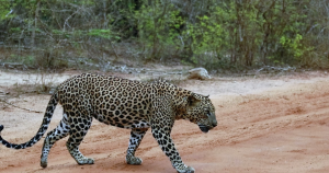 Egy leopárd sétál egy földúton, zöld lombozatú erdővel körülvéve.