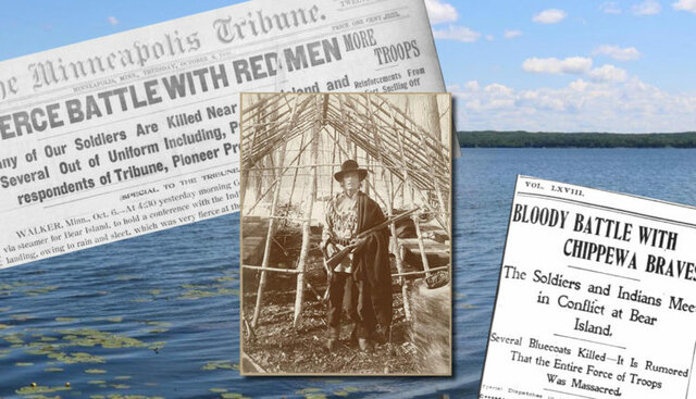 Régi fénykép egy nádfedeles kunyhó előtt álló személyről, a háttérben egy újságkivágással, amelyen a „MINNEAPOLIS TRIBUNE” cím szerepel, és a „CSATA VÖRÖS EMBEREKKEL” című cikk. A jelenetet egy víztömeg állítja be, az előtérben liliompárnákkal.