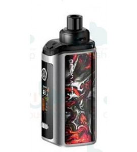 Elegáns, modern e-cigaretta fekete-piros dizájnnal, fémes felülettel és átlátszó műanyag ablakkal, amely az e-folyadékot mutatja be. A készülék alján USB-csatlakozó, felül pedig gomb található, oldalán logóval és márkajelzéssel.