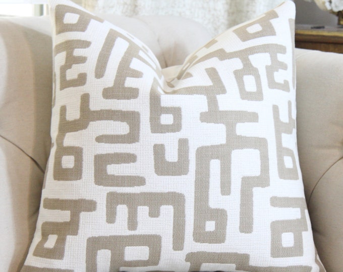 A beige sofa with a white pillow featuring a geometric pattern in shades of brown and beige.