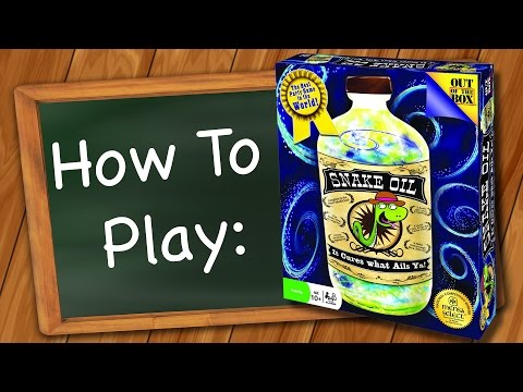 Egy palack „Snake Oil” látható egy fa felületen, palatábla háttérrel. A táblára a „Hogyan játszunk” szöveg van írva. Az üvegen kék címke található, zöld kígyó-illusztrációval és vastag betűkkel a „Snake Oil” felirattal. A címkén egy „Ne igyon” figyelmeztető üzenet és egy vonalkód is található. Az üveg kupakja barna, kék címkével.