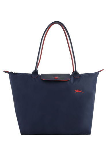 Fehér háttér előtt egy kék táska látható piros logóval az elején, valamint piros és kék fogantyúval.