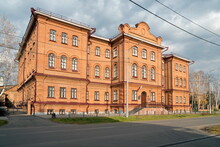 Az utcasarkon található egy nagyméretű, díszes téglaépület, több ablakkal és dekoratív bejárattal. Az épület kiemelkedő boltíves ajtóval és korláttal ellátott erkéllyel rendelkezik. Az épület felett villanyvezetékek futnak, részben felhős az ég. Az utca üres, az épület előtt járda van.