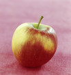 A red apple with a visible stem sits on a pink surface.