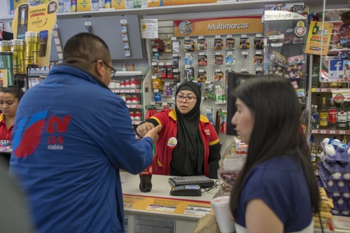 A man in a blue jacket is paying for a drink at a store counter with a cashier wearing a black headscarf and a red vest. The cashier is handling the payment, and there are various items on the counter, including a bottle of soda. In the background, there are shelves with bottles and a TV screen.