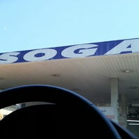 The first image shows a close-up view of a car's steering wheel, with the gas station's sign visible in the background. The sign reads 'SOGA' in large white letters against a blue sky. The gas station appears to be an outdoor facility with a white roof and a few lights mounted on the structure. The image is taken from inside the car, looking out towards the gas station.