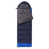 A blue and grey sleeping bag with a grey hood is displayed against a white background. The sleeping bag is rolled up, with the blue side facing the viewer and the grey side facing away. The hood is partially unzipped, revealing a grey interior lining.