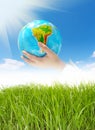 A hand holding a globe above a field of green grass under a blue sky with white clouds and a bright sun shining from the top left corner.