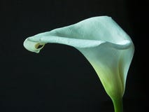 Közeli kép egy fehér virágról, zöld szárral, sötét háttér előtt.