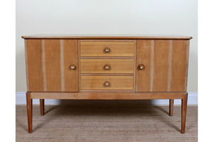 Fából készült komód világosbarna kivitelben, egyszerű kialakítással, három fiókkal, kerek gombokkal és lapos tetejével. A komód egy bézs színű szőnyegpadlón van elhelyezve egy sima fehér fal mellett.