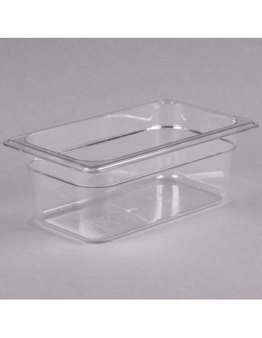 A clear plastic container with a smooth surface and a flat bottom is placed on a white background. The container has a rectangular shape with a slightly curved top edge and is devoid of any labels or markings.