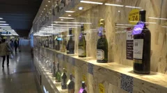 A wine store interior with a variety of wine bottles displayed on shelves. The bottles are illuminated from above, and there are price tags attached to each one. The store has a modern design with a tiled floor and a glass ceiling. There are people walking around, browsing the selection.