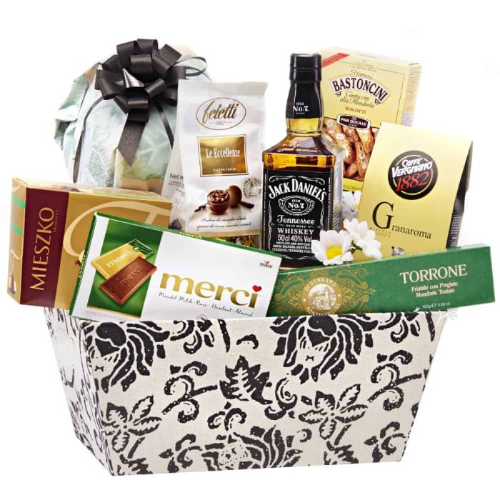 Ajándékkosár különféle ínyenc ételekkel és egy üveg whiskyvel. A kosár tetején fekete masni van, és fehér háttér előtt van elhelyezve. A kosárban számos elem található, köztük egy üveg Jack Daniel's whisky, egy doboz csokoládé, egy zacskó kávé, egy doboz sütemény, egy zacskó dió és egy doboz kekszet. A tételek szépen vannak elrendezve, a whiskys üveg függőlegesen áll a közepén.