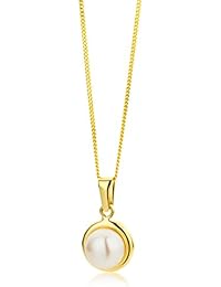 A close-up image of a gold necklace with a round pendant featuring a white pearl. The necklace is displayed against a white background, and the lighting highlights the gold and pearl, creating a warm and luxurious appearance.