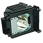 A close-up image of a projector unit with a black casing. The projector has a ventilation grille on top and a lens on the front. The unit is mounted on a white background, and there are visible screws and a metal bracket on the side.
