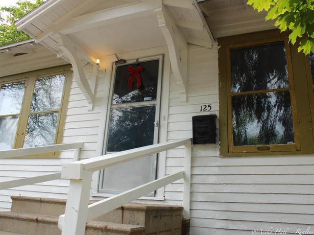 A small goat with a white and black coat is standing on a dirt ground with hay scattered around. The goat is chewing on a piece of hay, and there are droppings on the ground. The background shows a wooden fence and some greenery.