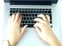 Egy ember keze egy ezüst laptop billentyűzeten gépel. A kezek úgy helyezkednek el, hogy a bal kéz a billentyűzet bal oldalán, a jobb pedig a jobb oldalon. A személy bal gyűrűsujján gyűrűt visel, és mindkét kezén festett körmök vannak. A laptop olyan felületre van helyezve, amelynek bal csuklóján egy óra látható.