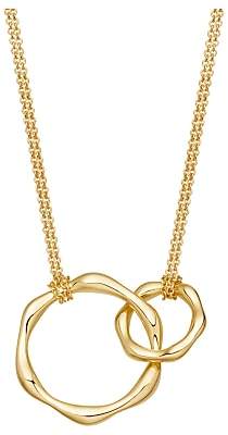 A close-up image of a gold necklace with a circular pendant featuring two interconnected rings. The necklace has a chain with a series of small circular links and is set against a white background.