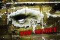The second image is a close-up of a section of the first image, focusing on the area where the bullet hole is located. The image is highly detailed, showing the texture of the wall and the bullet hole with a clear, white center. The word 'SECRET' is prominently displayed in red at the bottom of the image, with the letters 'TOP' in red and 'SECRET' in white. The image has a gritty, urban feel, with a dark and moody atmosphere.