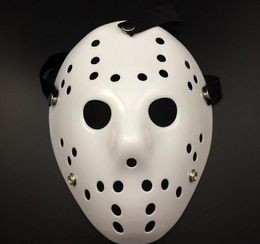 A white plastic mask with black straps and a black buckle is displayed against a black background. The mask has a large, round, black eye on the left side and a smaller, black eye on the right side. There are three silver rivets on the left side of the mask, and the mouth is open with a black interior.