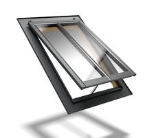 Egy elegáns, modern ablak fekete kerettel és átlátszó üvegtáblákkal fehér háttér előtt jelenik meg. Az ablak ferdén helyezkedik el, a bal felső sarok a jobb alsó sarok felé mutat. Az üvegtáblákat vékony fekete bordák osztják négy részre, és az ablak lágy árnyékot vet az alatta lévő fehér felületre.