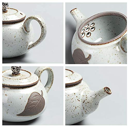 A ceramic teapot with a textured surface and a leaf design on the lid is shown in four different angles. The teapot has a curved spout and a handle with a decorative loop at the top. The lid has a small knob on top and a circular pattern with a leaf design. The teapot is placed on a surface with a soft gradient background.