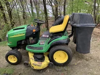 A green lawn mower with a yellow seat and a black trash can attached to the back is parked on a grassy area surrounded by trees.