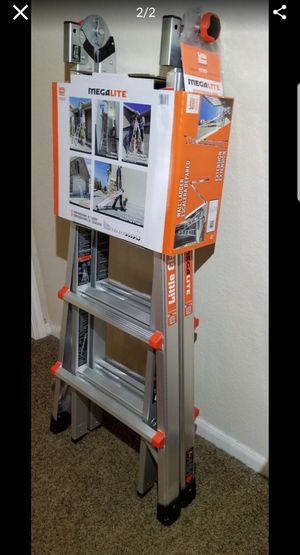 Egy bézs színű szőnyegpadlón áll egy ezüst-fekete fémlétra narancssárga és fekete biztonsági lábakkal. A létrát egy narancssárga és fehér színű kartondoboz veszi körül, amelyen a „MECALTITE” márkanév és a használatban lévő létra különféle képei láthatók. A doboz nyitva van, felül a használati utasítás látható.