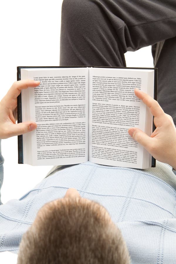 Egy személy hanyatt fekve egy könyvet olvas, két kézzel nyitva tartja. A könyvet az ember mellkasára teszik, az oldalak tele vannak szöveggel. A személy világoskék inget és sötét nadrágot visel. A háttér sima, világos színű.
