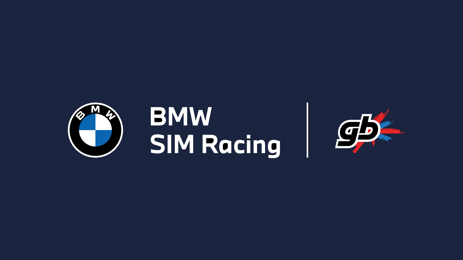 Sötétkék háttér a BMW SIM Racing logóval a bal oldalon és a G2 Esports logóval a jobb oldalon. A BMW logó beépül a BMW SIM Racing logóba.