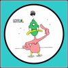 A cartoon character of a duck with a green head and a pink body is pointing upwards with its right wing. The duck is wearing a black hat and has a yellow beak. The background is a plain white circle with a blue border, and there is a small black and yellow logo in the top left corner.