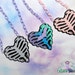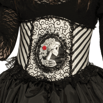 A close-up of a black and white striped corset with a lace-up front and a decorative silver buckle. The corset features a detailed lace trim and a central design with a floral pattern and a red flower. The background is a plain white color.
