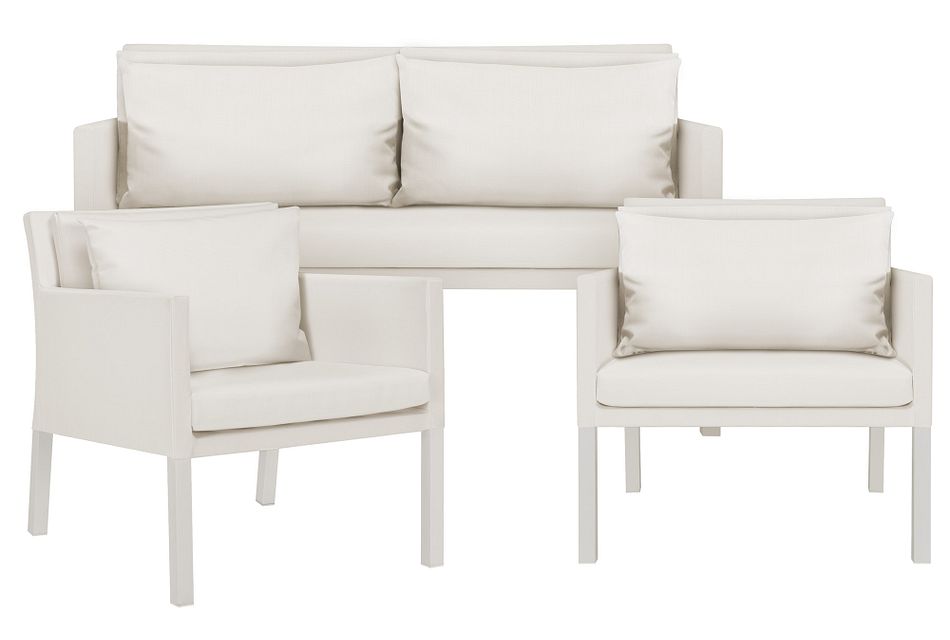 A set of four white modern chairs with a matching white cushioned seat and backrest, featuring a sleek design with a curved backrest and armrests.
