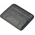 A black leather wallet with a visible brand logo on the front is lying flat on a white background.