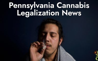 Az első képen egy csukott szemű férfi látható, jobb kezében egy megvilágított ízületet tart, amelyből füst jön ki. Szürke kapucnis pulcsit visel, és sötétkék háttér előtt helyezkedik el. A képen a „Pennsylvania Cannabis Legalization News” felirat látható, külön sorban a „Pennsylvania”, „Cannabis”, „Legalization”, „News” szavakkal.