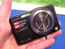 A person's hand is holding a black digital camera with a silver lens. The camera has a red and white logo on the top left corner and the brand name 'PANASONIC' on the bottom left. The camera's screen displays a compass with a digital time of 10:10.