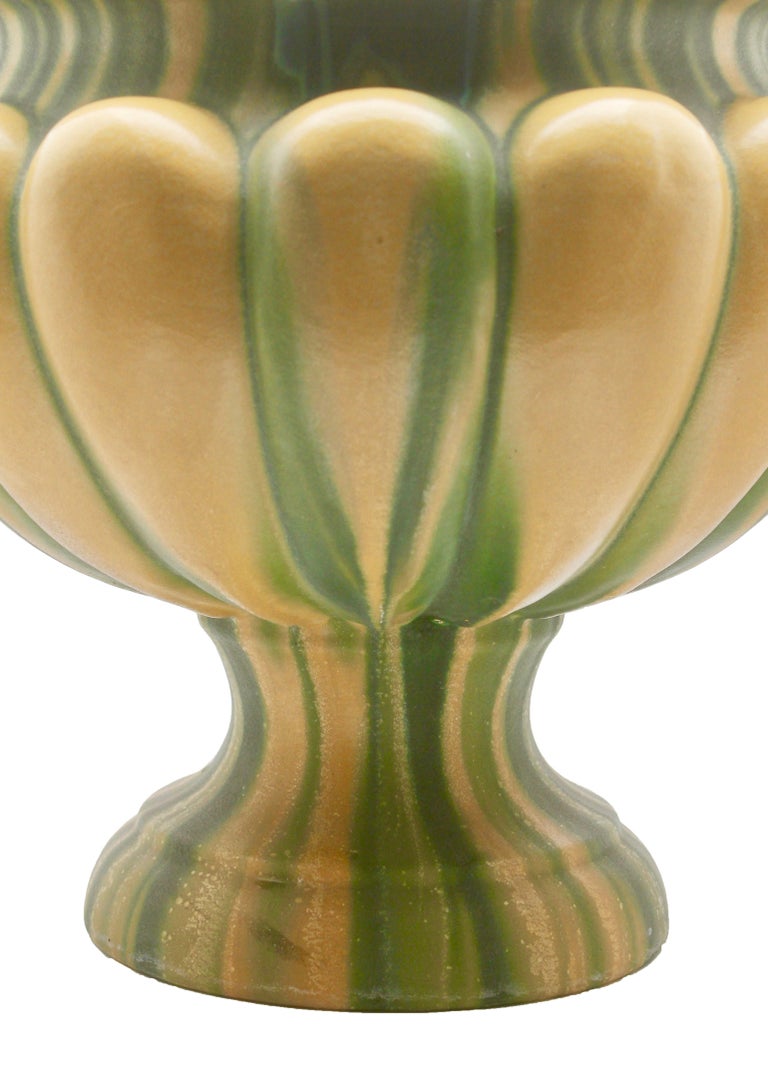 A ceramic bowl with a textured surface featuring a gradient of green and yellow hues, with a glossy finish. The bowl has a ribbed edge and a fluted interior, giving it a unique and artistic appearance.