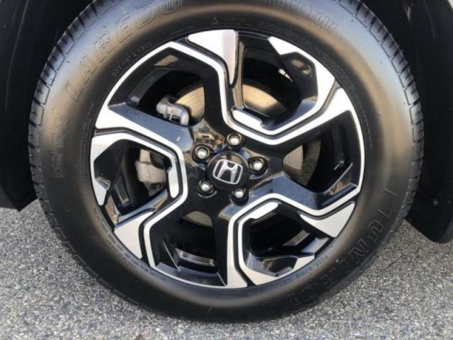 A close-up of a car tire with a detailed design on the rim. The tire is black with a white sidewall and the rim has a silver and black design with a prominent cross emblem in the center. The tire is mounted on a black rim with a Honda logo on the center cap. The tire is set against a grey background.