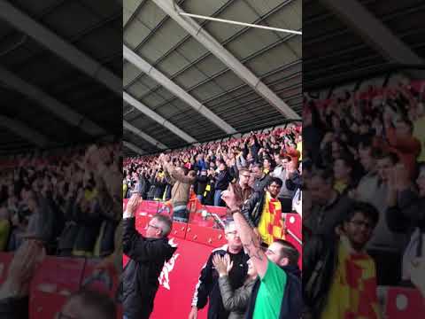 Zsúfolt stadion, a nézők ujjonganak és felemelik a kezüket. A közönség sűrűn zsúfolt, sokan sárga és piros ruhát viselnek. Energikus a hangulat, a tömeg a pályán zajló eseményre koncentrál.