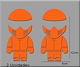 A digital illustration of two identical orange helmets with a visor, placed side by side. Each helmet has a detailed design with a metallic texture and a chin strap. Below the helmets, there is a scale with measurements in centimeters, indicating the height of the helmets. The scale ranges from 0 to 15 centimeters, with the helmets positioned at 12 centimeters. The background is a plain light gray color.
